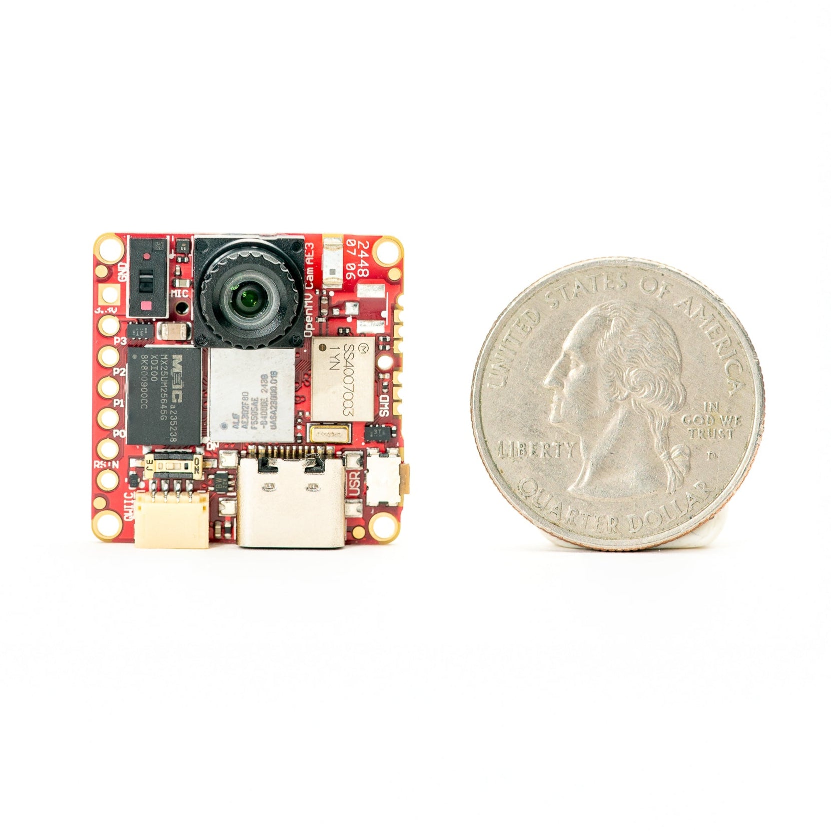 We believe in taking what is possible in a small package to the next level. Our cameras are tiny, about the size of a quarter. In that space we pack high-end microcontrollers with plenty of FLASH and RAM for running AI models, built-in connectivity like WiFi and Bluetooth, and sensors beyond just the camera like a microphone, a time-of-flight distance sensor, and an IMU.
