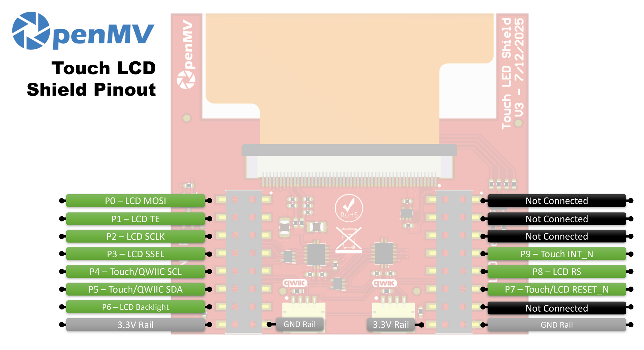 The Touch LCD Shield gives your OpenMV Cam the ability to display what it sees on-the-go while not connected to your computer. It features a 2.3" 320x240 16-bpp (RGB565) capacitive multi-touch TFT LCD display with a controllable backlight. Your OpenMV Cam's firmware has built-in support for controlling the LCD Shield using the SPI Display Class.